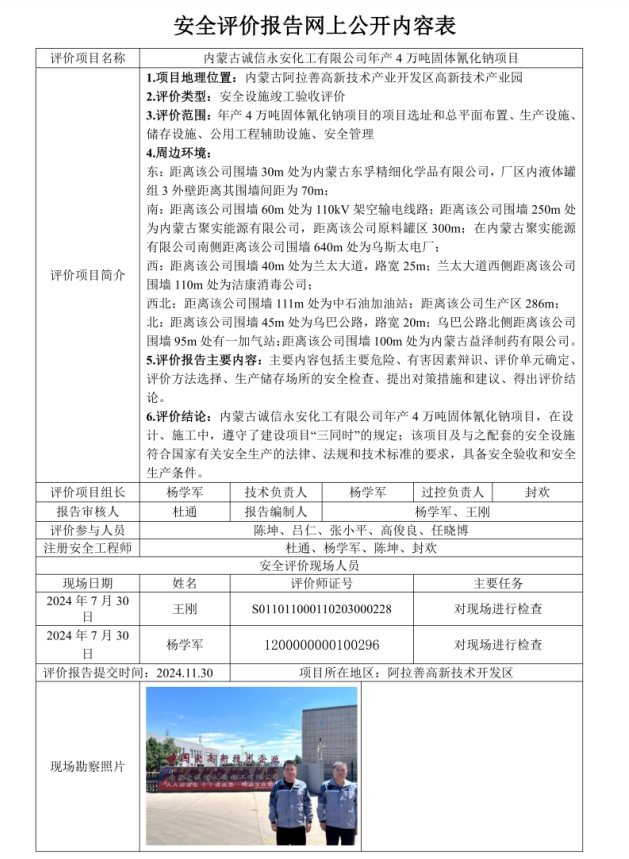 内蒙古诚信永安年产4万吨固体氰化钠验收评价